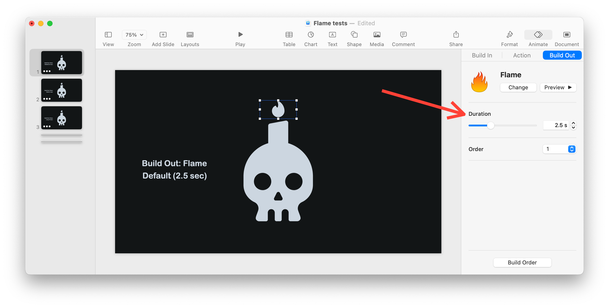 Every animation starts out at a standard duration. Flame's default is 2.5 seconds. That's what you saw above. But what if I made it more than twice as fast?